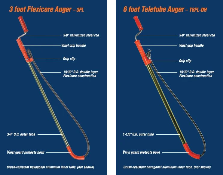 A cleaner way to open clogged drains. The 1/4″ (6 mm) spring is fed out of the drum into the line, keeping it away from clean kitchen and bathroom surfaces. SM models have a rugged steel drum and a “T” grip handle for more convenient use in laundry tubs. Complete directions on back of card. Also available individually boxed.